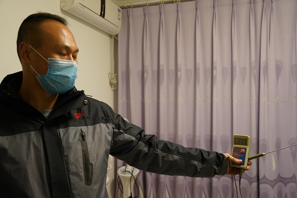 在20號樓3單元6樓的住戶家中,劉婷用手摸了摸用戶家的地板磚,通過人體的直觀感受,發現用戶家地暖存在散熱不均勻的現象。客服管家用專業的測溫儀和熱成像儀,進行了測溫。經檢測,該用戶家各房間平均溫度均在23℃以上。用戶說,家中較冷的房間是廚房,客服管家又針對廚房進行了測溫,發現室溫要比其他房間溫度低一些,但熱成像儀測得的結果與其他房間一致。經過觀察與分析,發現用戶家廚房與陽臺間的隔斷是一扇落地大玻璃門,保溫效果較差,導致廚房溫度低于其他房間。聽了工作人員的講解,用戶也表示了認可,對我們的排查結果及服務態度表示滿意。