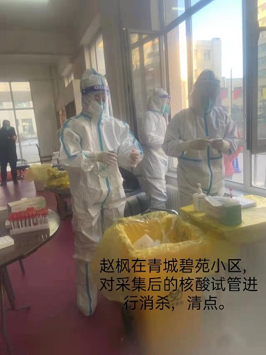 趙楓的工作是對核酸采集好的試管進行消毒處理然后清點,她所在小區(qū)居民大概900多人,每天的工作量不僅大,而且需要非常細心。剛開始的時候志愿者輪換崗位進行工作,由于其他志愿者不熟悉工作導(dǎo)致試管排序有誤,她主動提出來幫助清點,進過兩個小時的細心的盤點終于理清了,從此之后她就一直進行這項需要耐心和細心的工作。這也正是她對生活和工作的真實寫照,對生活她保持熱愛之心,積極向上;對工作一絲不茍,勇往直前,身上擔著的是責任,亦是榮幸。